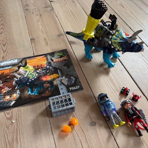 Playmobil dinosaur legesæt med figurer og tilbehør. Sættet indeholder blandt andet en større base/fort-lignende bygning, dinosaurfigurer, menneskefigurer, træer, stige, køretøj og diverse små dele som våben, kasser og andre smådele.