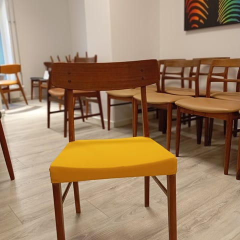 4 stk flotte teakstole af ukendt fabrikat. Danske og cirka 1960. Burde ombetrækkes med nyt Skay men kan anvendes som de er.