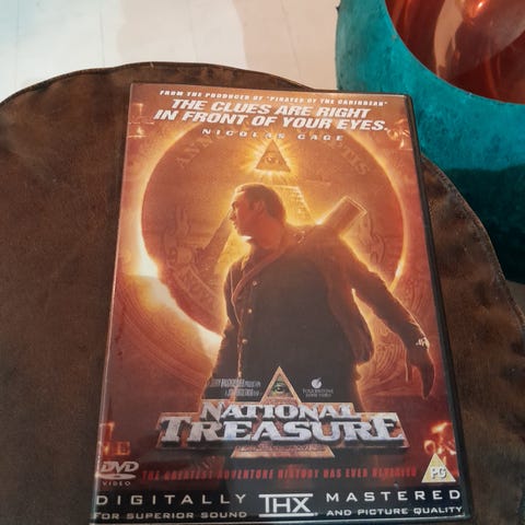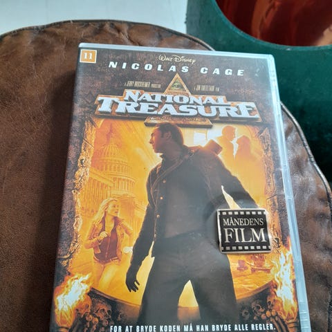 Disney National Treasure dvd. Actioneventyrfilm med Nicolas Cage udgivet på dvd. Standard dvd-cover med filmplakat på forsiden. Velegnet til afspilning på dvd-afspillere, der understøtter regionen angivet på omslaget.