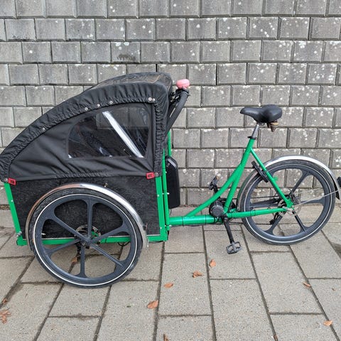 7 indvendige gear.Godkendt lås…Gode dæk…Ingen rust….Tilbehør : Bænk m/sort pude.. Y sele + alm.sele. Helt ny Bugatti kaleche xl …..4.800,-