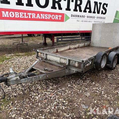 Biltrailer med dobbeltaksel og stålkonstruktion i galvaniseret udførelse. Længde ca. 407 cm og bredde ca. 172 cm. Traileren har perforerede køreskinner og er egnet til transport af biler eller andre køretøjer. Udstyret med næsehjul, lygter bagtil og markeringsreflekser på siden. Registreringspladeholder og træk med kuglekobling foran. Velegnet til brug, hvor der er behov for transport af tunge emner på en åben, lavbygget trailer. Akslerne er rustne og skal fikses, se evt. billede. Har ikke papirer på den, da firmaet er lukket og disse derfor ikke kan fremfindes. Kan bære lige over 1000 kg.