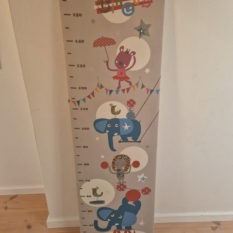 børnehøjde måler på lærred med motiv af farverige fly og helikopter på blå baggrund. Højdemåleren går fra ca. 60 til 150 cm og er trykt på et opspændt lærred på træramme, beregnet til ophængning på væg i børneværelse. Velegnet til at følge barnets højde over tid og som dekorativ vægudsmykning.