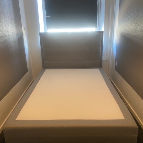 Sengen står på lyse træben og har lamelbund, som medfølger.