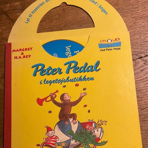 Margret & H.A. Rey - Peter Pedal børnebog med hårdt omslag, gul forside med illustrationer og rød ryg. Bogen indeholder flere historier om Peter Pedal og er udgivet af Carlsen.