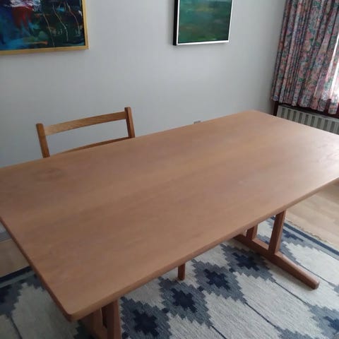 Shakerbordet stod ikke alene i Børge Mogensens private spisestue. Det var samtidig en bordtype, han blev ved med at vende tilbage til gennem sin karriere som møbelarkitekt. Denne model tegnede Børge Mogensen for FDB i 1950, men den nåede aldrig at blive sat i produktion. Muligvis på grund af de korsformede ben, der dengang både var et dristigt design og en svær konstruktion at få til at gå op. Mange år efter lancerer FDB Møbler bordet, der, trods skiftende samfundstendenser inden for boligindretning, fremstår tidløst og med en æstetisk holdbarhed. Med det elegante og unikke understel, der er trukket ind under bordpladen, virker den enkle, rektangulære plade som svævende frit i rummet og giver samtidigt god plads til benene. Bordet, der bærer præg af funktionalitet med en praktisk slidflade og de afrundede kanter, bygger på Børge Mogensens ufravigelige krav om, at et møbel skulle tjene mennesket og give plads til den menneskelige udfoldelse frem for med djævlens vold og magt at tilpasse mennesket til møblet.