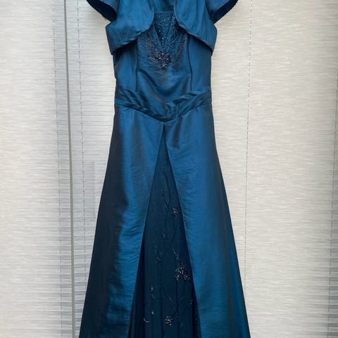 Magic M festkjole. Overdelen er rynket med små dekorative detaljer, og skørtet er glat og let skinnende. Modellen er velegnet som fest- eller cocktailkjole og er brugt en enkelt gang.