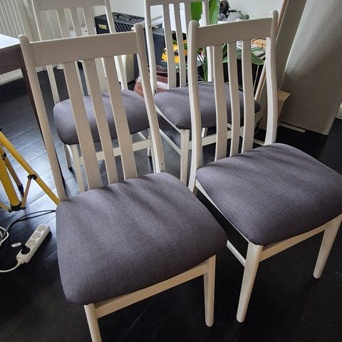Stolene står stabile, pæne og med lidt brugsspor på stel