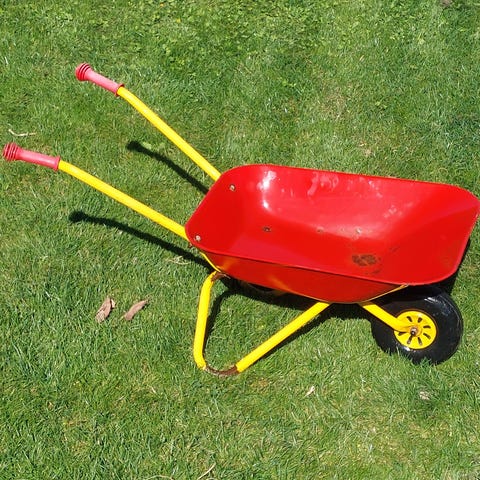 Plasto trillebør legetøj i plast, i rød med gule håndtag og hjul. Velegnet som udelegetøj til børn, f.eks. i sandkasse eller have. Robust plastkonstruktion med ét hjul foran og to håndtag bagtil, som gør den let for børn at skubbe og manøvrere.