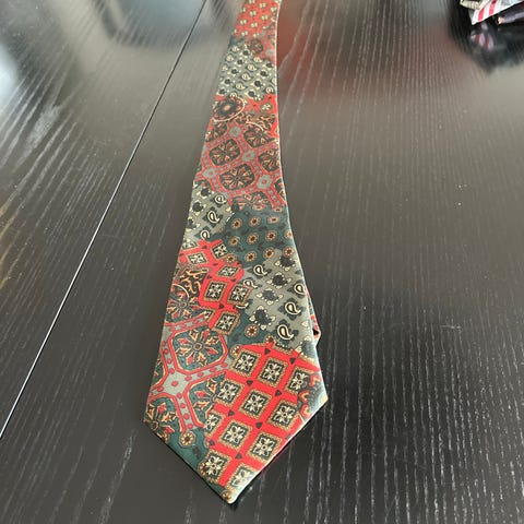 Kai Long slips til mand i 100 % silke. Slips i grå nuance med røde, hvide og lyseblå diagonale striber og ternet mønster. Bagsiden har mørk, let prikket foring og holderstrop med mærkelabel. Egnet til brug sammen med skjorte og jakkesæt ved både formelle og mere afslappede lejligheder.