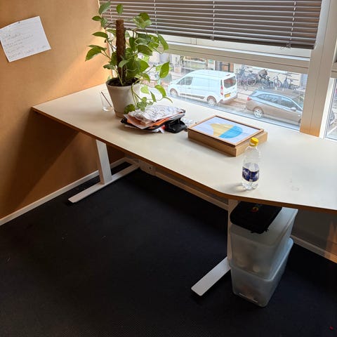 🔸️ Monteret kabelbakke under bordet til skjult ledningsføring.