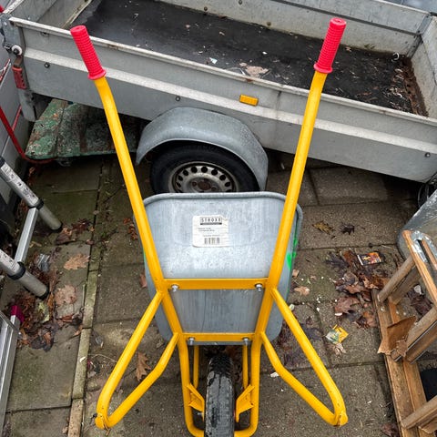 Trillebør i metal med ét hjul og metalstel. Kassen er i galvaniseret metal med synlig overfladerust indvendigt. Udstyret med gummihåndtag på skubbestænger for bedre greb. Velegnet til transport af jord, grus, haveaffald og lignende i have og på byggeplads. Høje kanter velegnet til murer.
