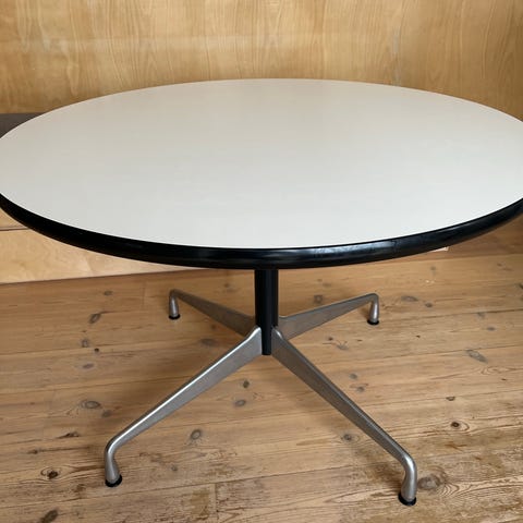 Vitra Eames rundt spisebord med en bordplade i hvid HPL/laminat og rund form med en diameter på ca. 110 cm. Bordet har sort kant og understel i metal med kromfinish og fire ben. Designet er egnet som spisebord eller mødebord i køkken, stue eller kontor. Fremstillet i 2010 ifølge mærkaten under bordpladen. Stolene på billederne er ikke beskrevet som en del af produktet og kan være vist som eksempel på anvendelse.