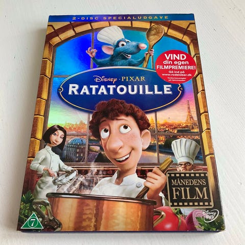Disney Pixar Ratatouille dvd film. Animeret familiefilm om den madglade rotte Remy og kokken Linguini. Udgivelse med dansk aldersmærkning (7 år). Velegnet til afspilning på standard dvd-afspillere, hvor dvd-format understøttes.