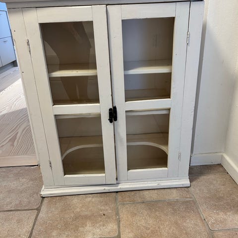 Vitrineskab med glaslåger og hylder. Skabet har to glaslåger på fronten og en indvendig hylde i hver sektion, som giver mulighed for opbevaring og udstilling af service, glas eller andre genstande. Retro. Mærke og producent er ukendt