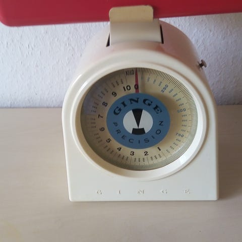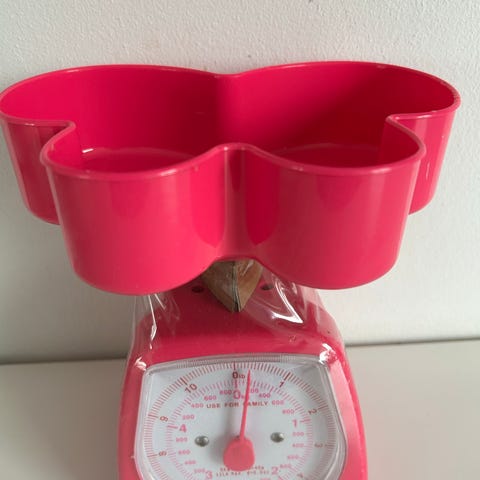 Rice køkkenvægt i pink plast med analog visning. Vægten har en aftagelig skål formet som en sommerfugl, der kan bruges til at veje ingredienser i køkkenet. Egnet til almindelige køkkenopgaver som bagning og madlavning, hvor der er behov for at måle mindre mængder råvarer.. Den er helt ny
