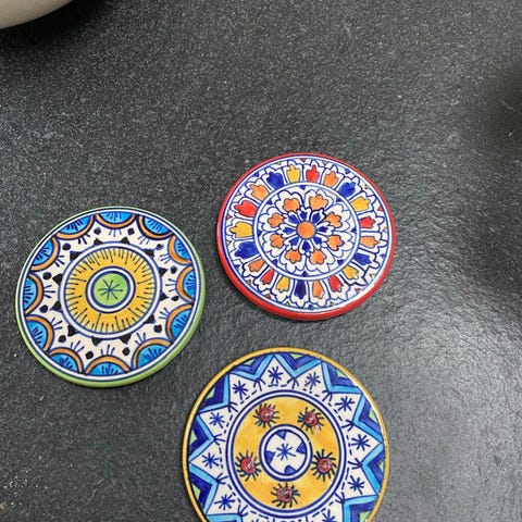 Neofitou Keramik keramiske glasbrikker med holder i flerfarvet design. Sættet består af runde glasbrikker med dekoreret mønster i forskellige farver og en metalholder til opbevaring. Glasbrikkerne er håndlavede i keramik og egner sig til brug under glas, kopper eller mindre skåle på bordoverflader.