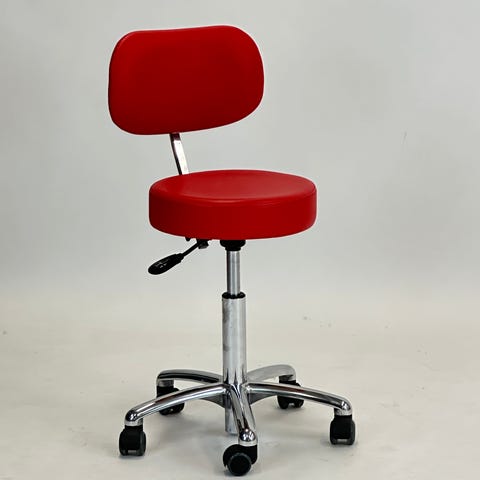 Postkasserød arbejdsstol fra Vela. Højdejusteres elektrisk, men opladeren er forsvundet i forbindelse med flytning for nogle år siden, og derfor ikke brugt eller testet siden.