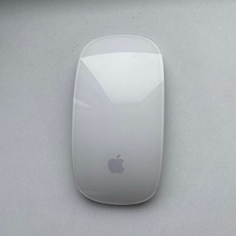 Apple Magic Mouse trådløs mus i hvid. Optisk mus med multitouch-overflade på toppen. Musen er beregnet til brug med Apple-computere via trådløs forbindelse (Bluetooth). Der medfølger opladnings-/datakabel som vist på billederne. Velegnet som erstatnings- eller ekstra mus til Mac-computer.