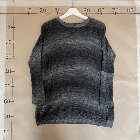 Liggende fladt er længden 45 cm, bredden lige under ærmer 44 cm.
