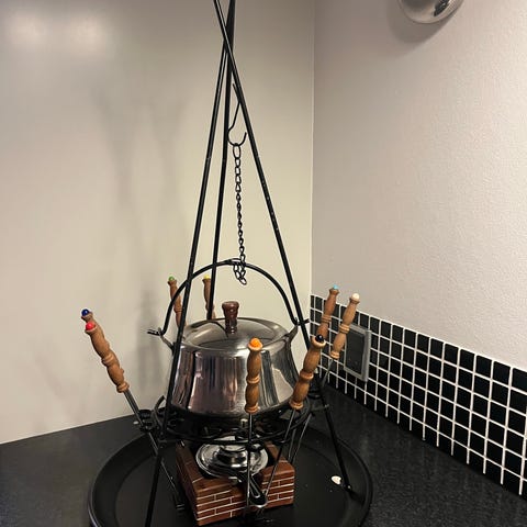 Meget velholdt. Casron retro støbejern med 6 skåle, træplade og gafler.