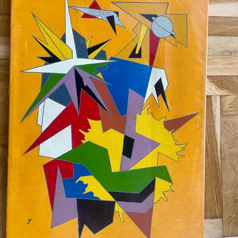Abstrakt maleri i akryl på lærred. Motivet består af geometriske former i grøn, rød, gul og orange på blå baggrund. Signeret med initialerne “BB” og årstal “70” i nederste hjørne.
