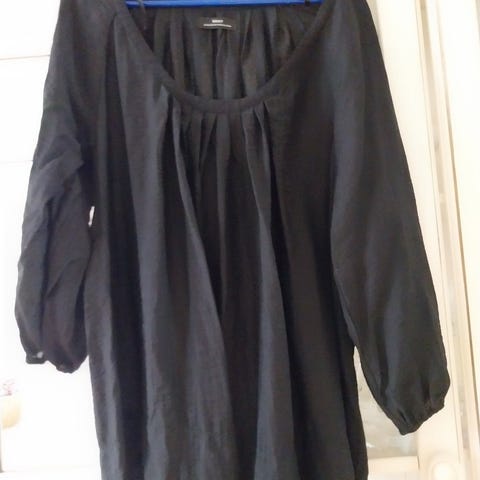 Str. 38. Mål liggende fladt: længde 62 cm, bredde lige under ærmer 43 cm.