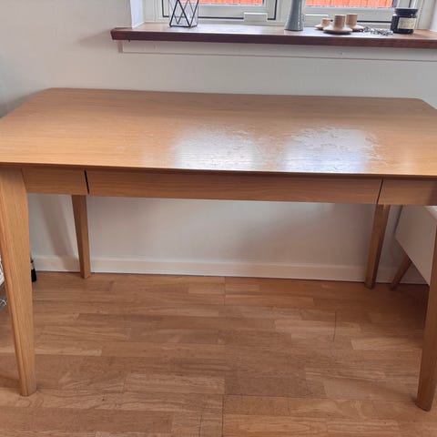 Pænt fyrretræs skrivebord men mange opmagasinere.