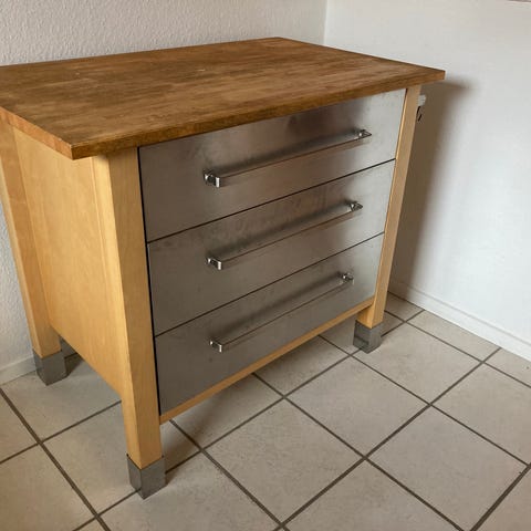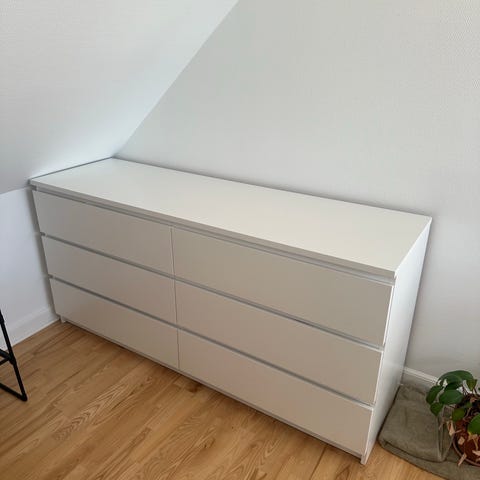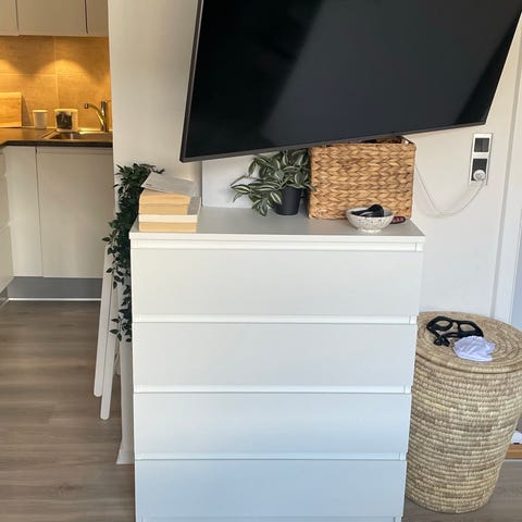 Jysk kommode i lyst trælook med 4 skuffer. Kommoden har glatte fronter uden greb og en ensartet overflade i træmønster. Skufferne er dybe og egnede til opbevaring af tøj, tekstiler eller andre mindre genstande. Passer til soveværelse, entré eller stue som ekstra opbevaringsplads. Møblet står som ny udover en enkelt flække i det nederste bræt (ikke en del af skufferne) som vist på billedet.