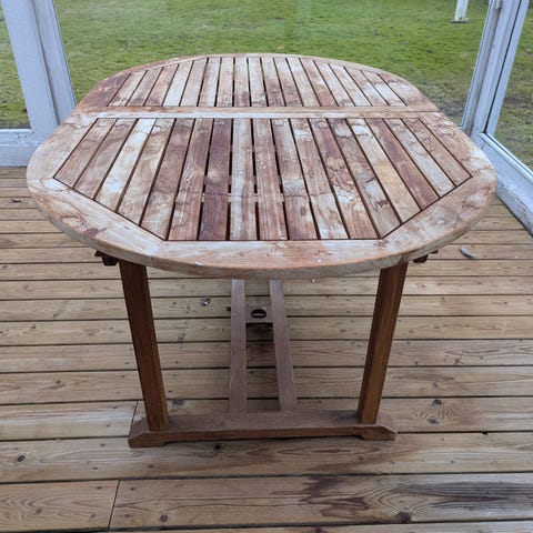 Havebord og stole sæt i teaktræ. Sættet består af et større, ovalt udtræksbord med lamelbordplade samt 4 positions stole med armlæn og lamelsæde/-ryg. Træet fremstår vejrpatineret. Egnet til brug på terrasse eller i have. Bordet har understel med udskæring i midten til mulig parasolmontering.
