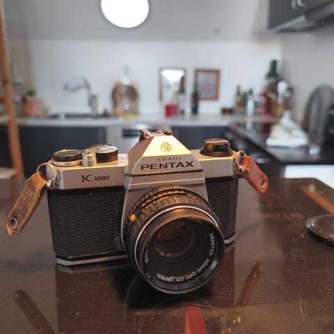 Pentax SP1000 analogt spejlreflekskamera med udskifteligt objektiv. Kamerahuset er i sølv/sort med mekaniske indstillingshjul til lukkertid og filmfremføring. På toppen ses modelbetegnelsen SP1000. Objektivet er et Pentax SMC Takumar med manuel fokusering og blændeindstilling. Kameraet bruger 35 mm film og har optisk søger. Der medfølger bærestrop med Pentax-logo som vist på billederne.