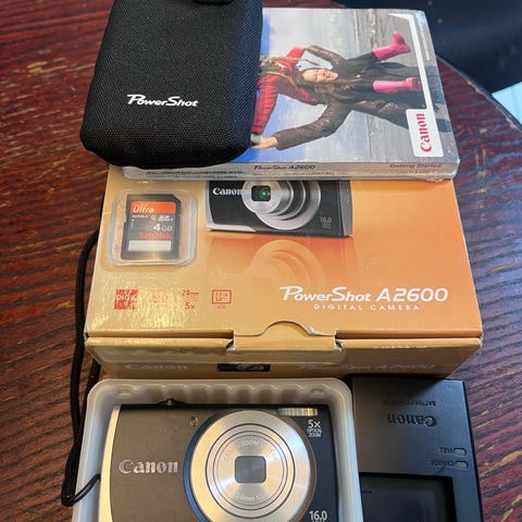 Canon Powershot A400 i kompakt lommeformat. Kameraet har indbygget zoomobjektiv, lille LCD-skærm på bagsiden til billedvisning og menunavigation samt indbyggt blitz. Huset er i sølvfarvet plast/metal med kobberfarvet frontpanel og håndledsrem i stof. På billederne ses kameraet sammen med et SD-hukommelseskort og et batteri, som følger med i handlen. Velegnet som enkelt digitalkamera til hverdagsbrug og rejser.