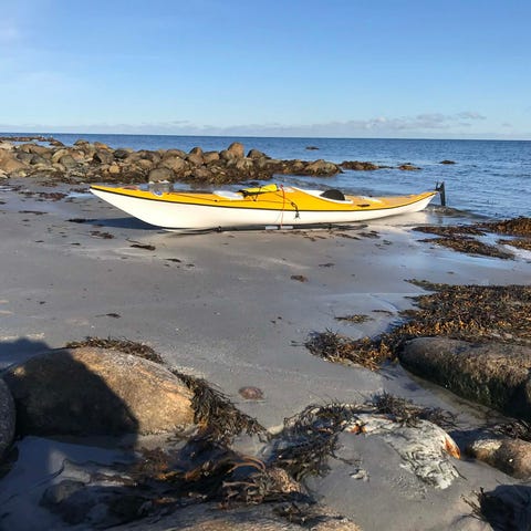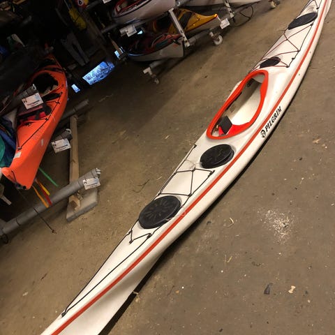 Zegul Arrow Play MV havkajak i blå/hvid. Med finne og ror. Kajakken er købt i 09/2024 og har ikke sejlet meget. Størrelsen er fra 70 kg.