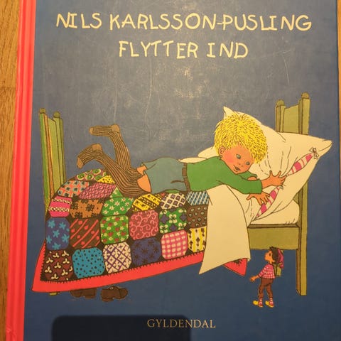 Astrid Lindgren Pusling bog. Billedbog med illustrationer på forsiden, der viser en dreng på et børneværelse. Egnet som højtlæsningsbog eller til selv læsning for børn, afhængigt af læseniveau. Trykt bog i klassisk format med illustreret omslag.