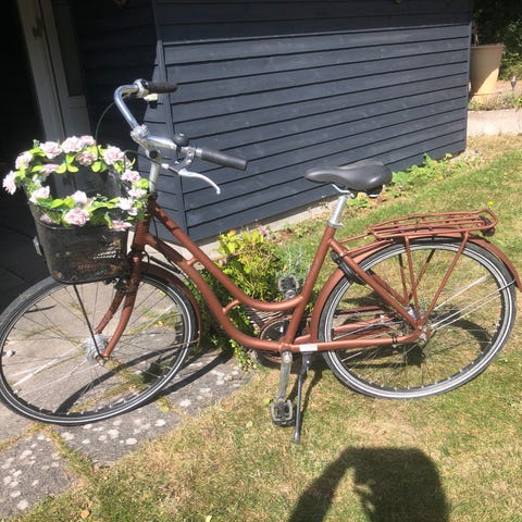 Kildemoes Nordby citybike i unisex-design med 28" hjul og stelstørrelse L. Cyklen er udstyret med fastmonteret frontkurv og bagmonteret barnesæde. Klassisk opret kørestilling med styr og sadel i brun farve. Velegnet som daglig pendler- og hverdagscykel i byen. Stel og udstyr fremstår som på billederne, herunder brugsspor på håndtag og barnesæde.