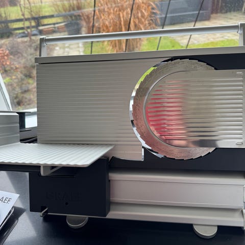 Severin pålægsmaskine til skiveskæring af brød, kød, ost og andre fødevarer. Maskinen har en rund metalskive som kan justeres i skivetykkelse via drejeknap på siden. Der medfølger en ekstra skæreskive, som ses på billederne. Pålægsmaskinen har glideoverflade til emnet, aftagelig plastskærm og strømtilslutning med almindeligt stik. Velegnet til brug i køkkenet til præcis skæring af forskellige råvarer.