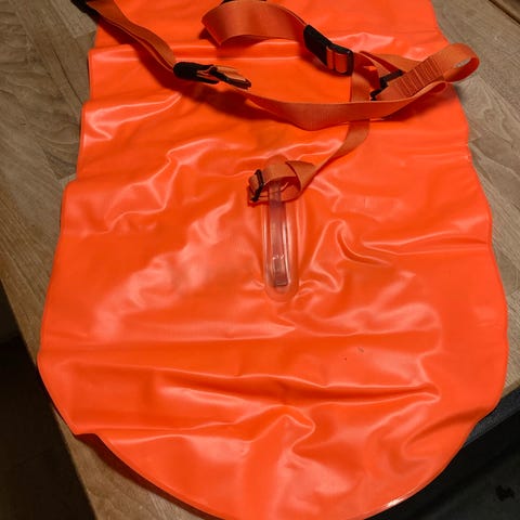 Orange oppustelig svømmebøje. Bøjen har ventil til oppustning og et bærehåndtag på midten. Den kan bruges som synlighedsbøje ved svømning i åbent vand og som mindre oppustelig flydeenhed, der kan fastgøres til kroppen med remmen. Velegnet til aktiviteter som havsvømning, hvor ekstra synlighed i vandet er ønsket.