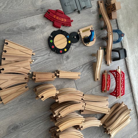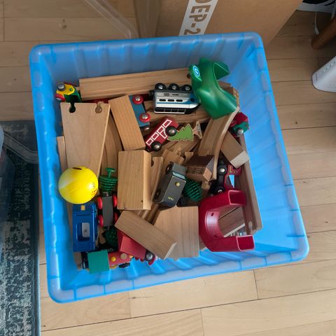 BRIO togbane træsæt med tilbehør. Sættet består af forskellige træs skinner, tog og vogne samt diverse tilbehørsdele, som eksempelvis bygninger og elementer til opbygning af en togbane. Delene leveres samlet i plastkasser, som kan bruges til opbevaring. Velegnet til leg med BRIO trætog og udbygning af eksisterende BRIO baner.