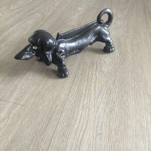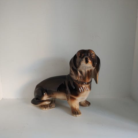 Dekorativ gravhund figur i farverigt mønster. Figuren forestiller en gravhund i hel figur og er dekoreret med flerfarvet, grafitti-lignende motiv i blandt andet rød, gul, blå, hvid og orange. Egnet som pyntegenstand på hylde, reol eller bord. Bunden har små dutter, så figuren står stabilt på en plan overflade.