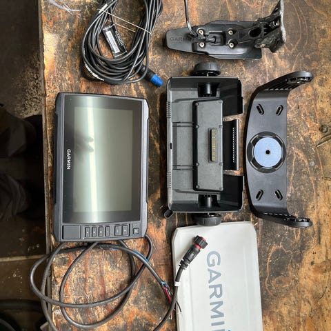 Garmin GPSMAP 92 sv kortplotter med 9”farveskærm i sort kabinet. Enheden har knapper i højre side til betjening af menuer og funktioner. På bagsiden ses stik og tilslutninger til strøm og eksterne enheder. Medfølgende beslag og kabler til montering i båd. Kortplotteren viser søkort, position, kurs, hastighed og andre navigationsdata på skærmen og er egnet til maritim navigation.