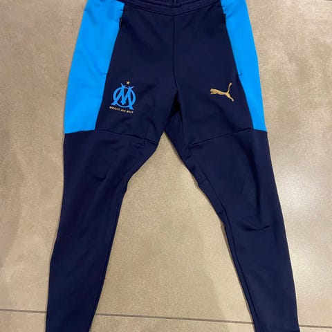 Puma træningsbukser i navy til børn. Bukserne har elastik i taljen og er fremstillet i et let, glat materiale egnet til sport og træning. På det ene ben er der klublogo og nummertryk. Velegnet som trænings- eller løbebukser. 152cm