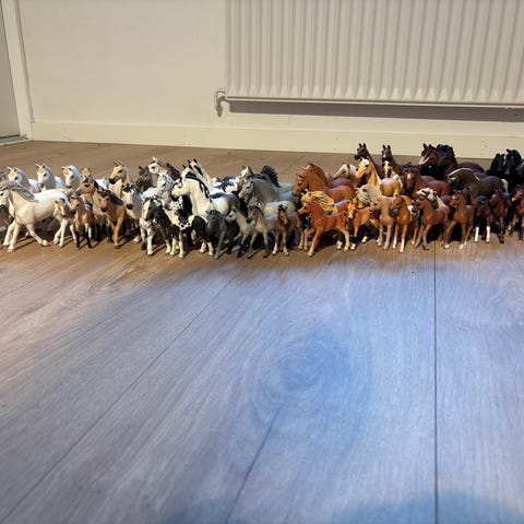 Schleich hestefigurer i plast. Sættet består af flere forskellige heste og føl i forskellige farver og størrelser.