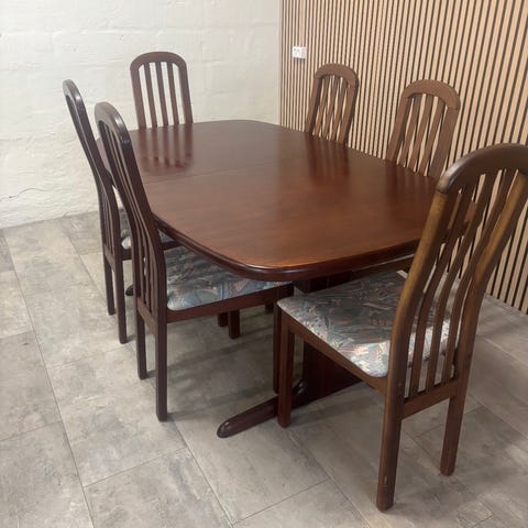Spisebord med synkron udtræk, som nyt inkl. 6 spisebordsstole og 2 tillægsplader.