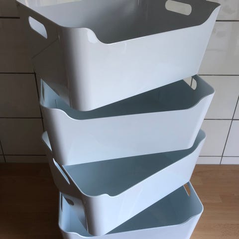 IKEA opbevaringsbokse i gennemsigtig plast. Bokse i rektangulær form, velegnet til opbevaring af mindre genstande i skuffer, skabe eller på hylder. Det klare plastmateriale gør indholdet synligt og gør det nemt at organisere og holde overblik. Kan stables eller bruges enkeltvis afhængigt af behov og plads.
