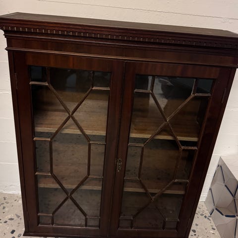 Vitrineskab i massivt fyrretræ med to glaslåger og trægreb. Skabet har sprossede ruder i front og sider samt hylder indvendigt til opbevaring eller udstilling. Overkanten er udformet med buet kant, og toppen kan bruges som ekstra afsætningsplads. Egnet som væg- eller bordskab i køkken, stue eller spisestue.