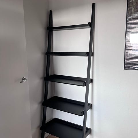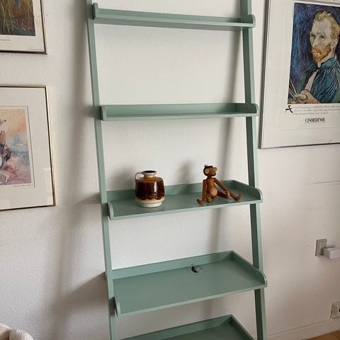 Sælger denne fine stigereol. Lille flig slået af nederst - ellers rigtig fin stand uden de store brugsspor. Højde 188 cm, bredde 85 cm og dybde i bunden 35 cm. Kan eventuelt fastmonteres i væggen, men står også uden.
