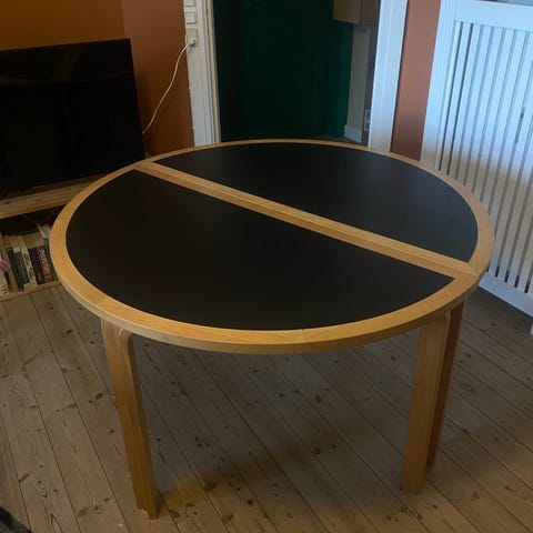 Smukt patineret rundt Alvar Alto bord, bordplade i sort lineolium. Har været flittigt brugt som legebord, - trænger nu til at komme videre.