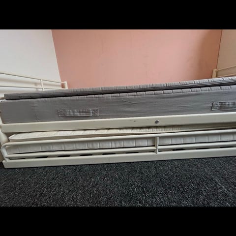IKEA dagseng med opbevaringsskuffer i hvid. Sengen har to store skuffer under liggefladen, som kan bruges til opbevaring af sengetøj eller andet. Madrassen kan udvides, så sengen fungerer både som enkeltseng og som dobbeltseng. Velegnet til brug i gæsteværelse, børneværelse eller som sofa om dagen og seng om natten.
