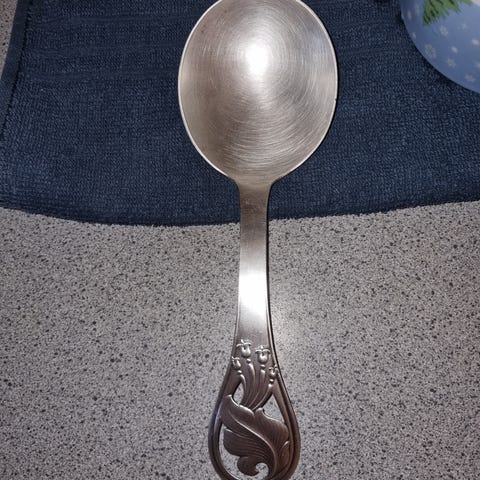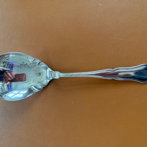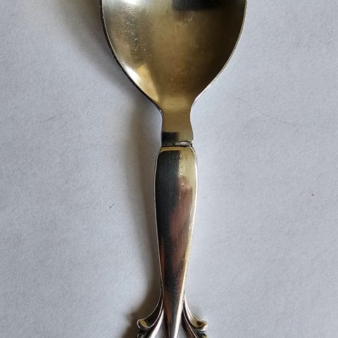 Serveringsske i rustfrit stål og tretårnet sølv Skeen har et mønstret skaft . Vægt 64 gr. L 21,7 cm.Signeret SJ , Johannes Siggard .