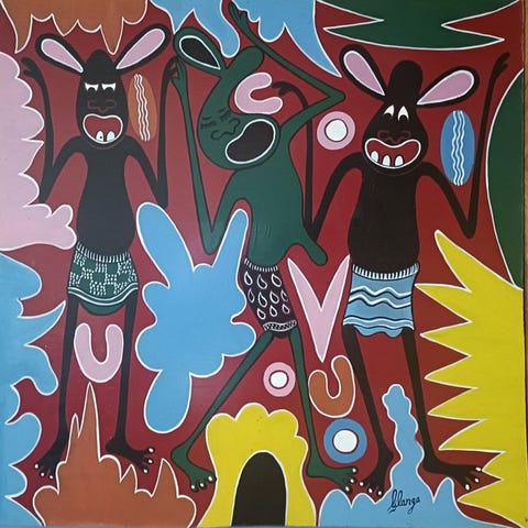 Peter paints mainly village scenes in a storytelling style. He has gradually come out of the Tingatinga mainstream in such a way that his work would now be best described as naive painting.