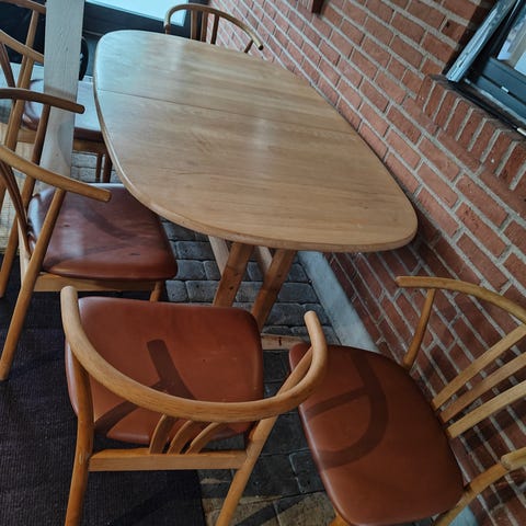 Sektions opbygget så boret kan være helt rund med en diameter på 135 cm eller indtage forskellige længder i spring på 70 cm op til 4,85 meter. De seks stole som medfølger er ikke dem der kan ses på billedet af bordet. Stolen der følge med er på et separat billede. Det er nogle rigtig lækre stole, som jeg lige nu ikke kan huske navnet på. Bordet er i kirsebærtræ og stolene er i kirsebærtræ og rustfri stål.